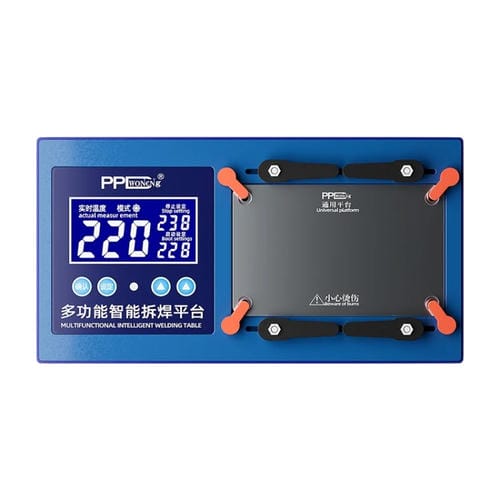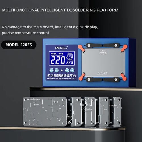 La Plataforma de Desoldar Inteligente Multifuncional PPD está diseñada específicamente para la Reparación de dispositivos iPhone 11 hasta iPhone 14 Pro Max, compatible con modelos que incluyen iPhone 11, 11 Pro, 11 Pro Max, 12 Mini, 12, 12 Pro, 12 Pro Max, 13 Mini, 13, 13 Pro, 13 Pro Max, 14, 14 Plus, 14 Pro y 14 Pro Max. Esta plataforma permite realizar desoldados precisos sin causar daños en la Placa Principal, gracias a su Pantalla Digital inteligente que ofrece un control exacto de la temperatura durante el proceso. Su sistema de calentamiento rápido y uniforme, junto con un diseño que previene deformaciones y quemaduras, facilita el desmontaje rápido de módulos mediante actualizaciones continuas del módulo de expansión. El equipo utiliza Enchufe de USA y está orientado a Técnicos y usuarios que reparan por cuenta propia que requieren una Herramienta confiable y eficiente para trabajos de desoldado en iPhones de última generación.
