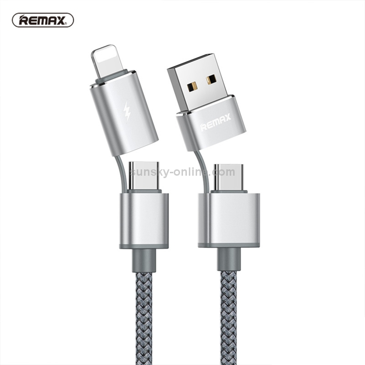 Cable carga Remax Rc-020T Aurora Serie 4 en 1 8 Pin + USB + 2x Tipo-C Sync (Plata)