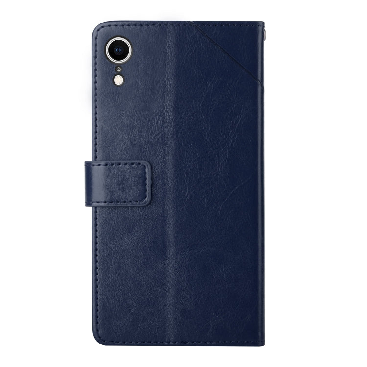 Caja de teléfono Y Costura para iPhone Xr con Tapa Horizontal Soporte Tragamonedas Cartera y Marco de Foto (Azul)