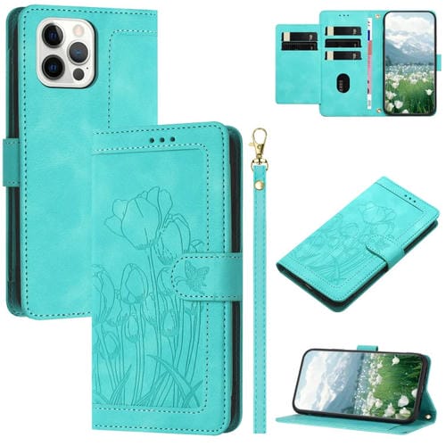 Funda de Piel con Relieve de Tulipanes para iPhone 12 Pro Max con Cordón (Verde)