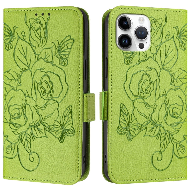 Pour iPhone 12 Pro Max Ătui de tĂ©lĂ©phone en cuir antivol RFID avec rose en relief (vert)