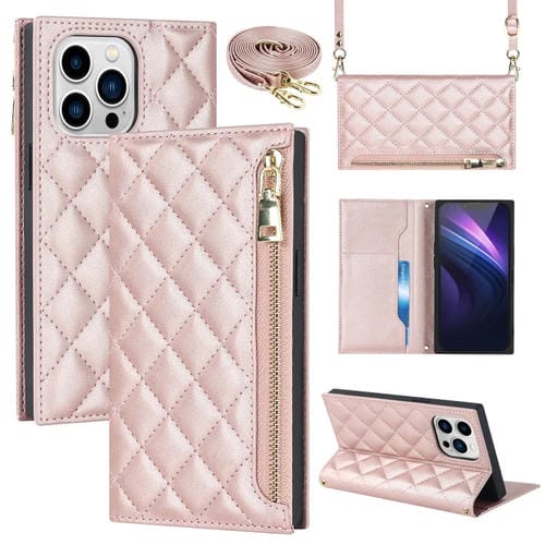 Funda de Cuero para iPhone 13 Pro Max Grid Texture con Lanyard y Cremallera (Oro Rosa)