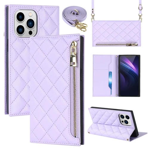 Funda de Cuero con Cremallera para iPhone 13 Pro Max Grid Texture Lanyard (PĂșrpura)