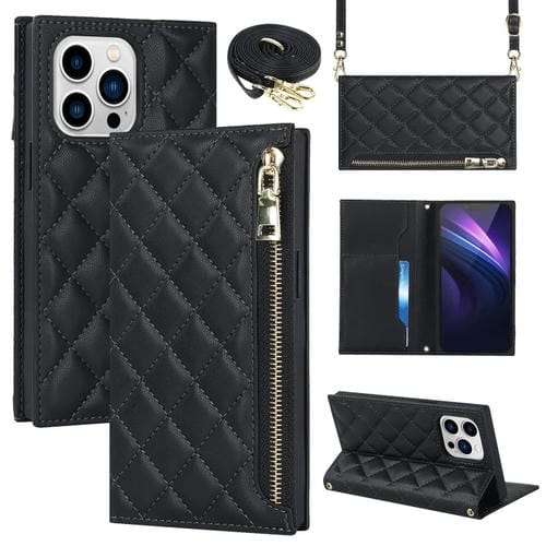 Funda para iPhone 13 Pro Max Grid Texture Lanyard de Cuero con Cremallera (Negro)