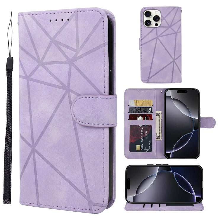 Funda de Cuero para iPhone 16 Pro Max con Líneas Geométricas y Tacto Sedoso (Morado)