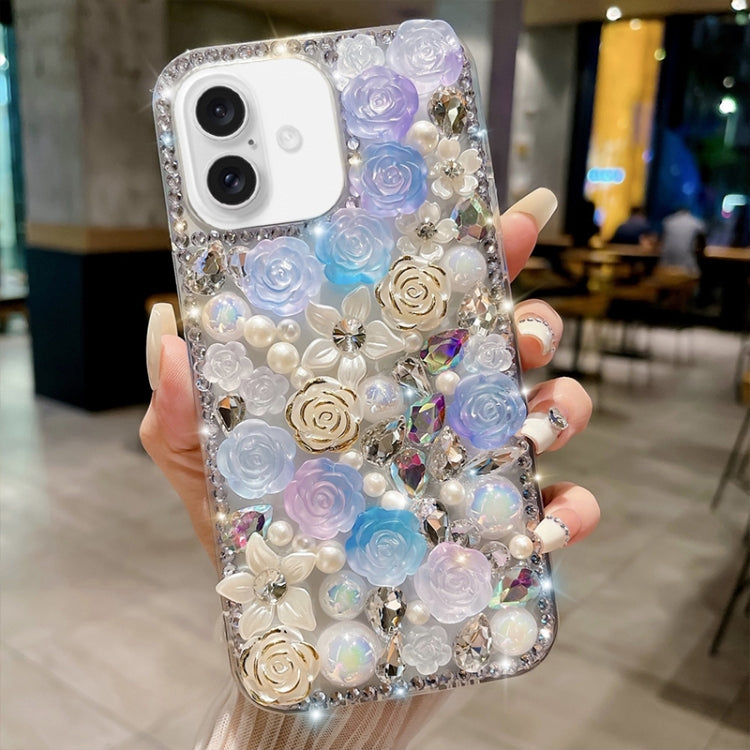 Funda para Teléfono PC con Diseño de Diamantes Perlados y Rosas para iPhone 16 (Azul)
