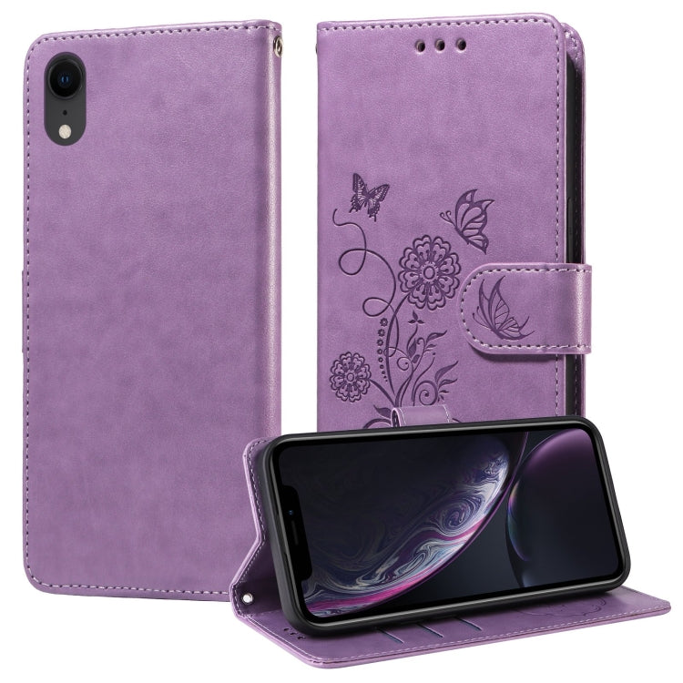 Funda de Piel para iPhone Xr Diseño de Mariposas y Flores en Relieve (Morado)