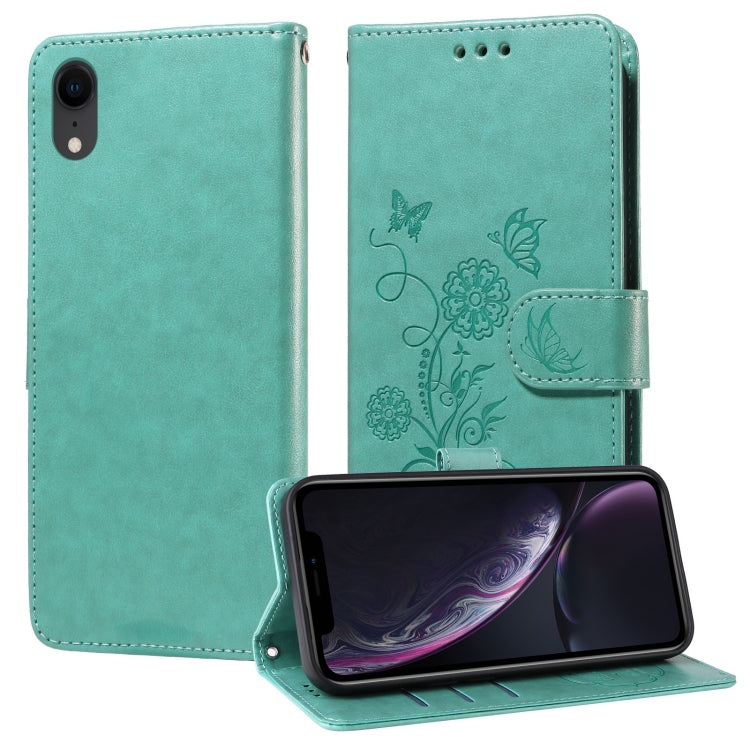 Funda de Piel para iPhone Xr Diseño Mariposas y Flores En Relieve (Verde)
