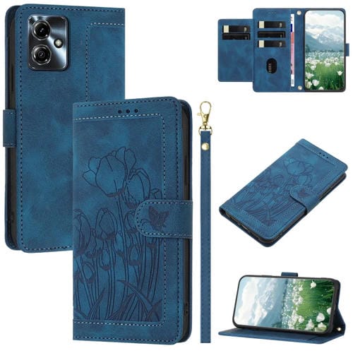 Funda de Cuero con Relieve de Tulipanes para Motorola Moto G14/G54 con Cordón (Azul)
