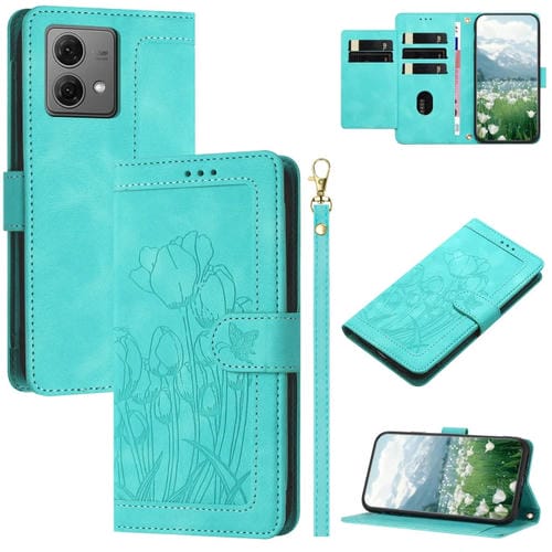 Funda de Cuero con Relieve de Tulipanes para Motorola Moto G84 con Cordón (Verde)