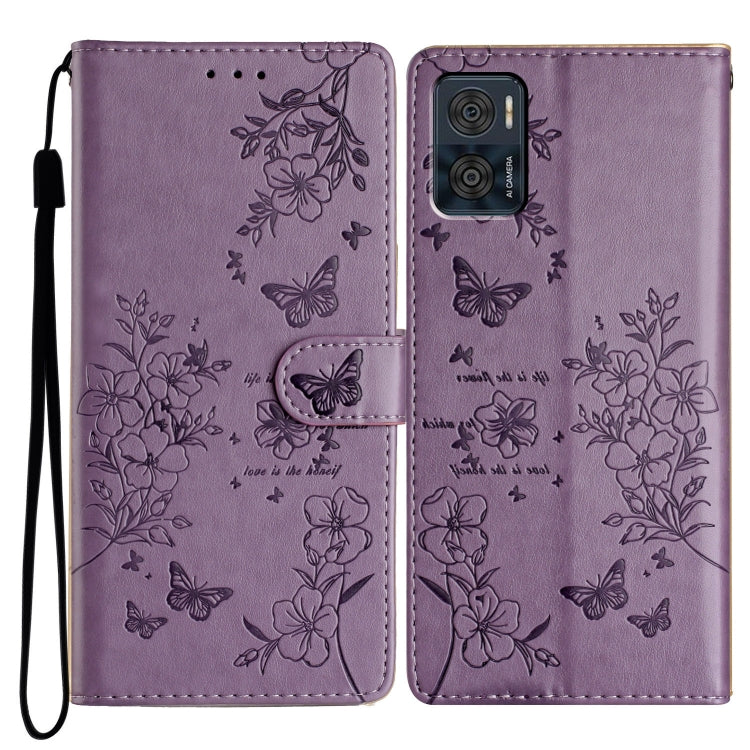 Funda de Cuero para Motorola Moto E22 con Mariposas y Flores (PĂșrpura)