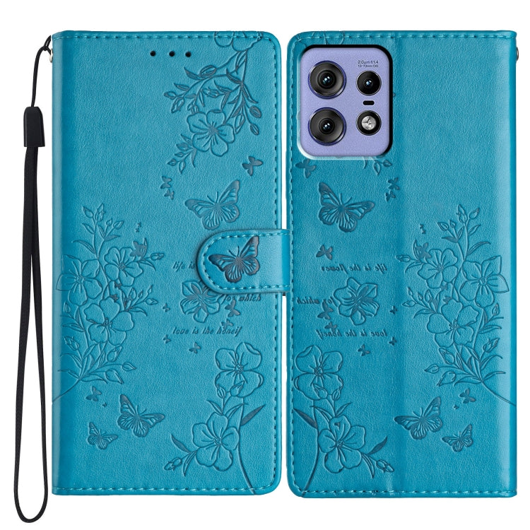 Funda de Cuero para Motorola Edge 50 Pro con Mariposas y Flores (Azul)