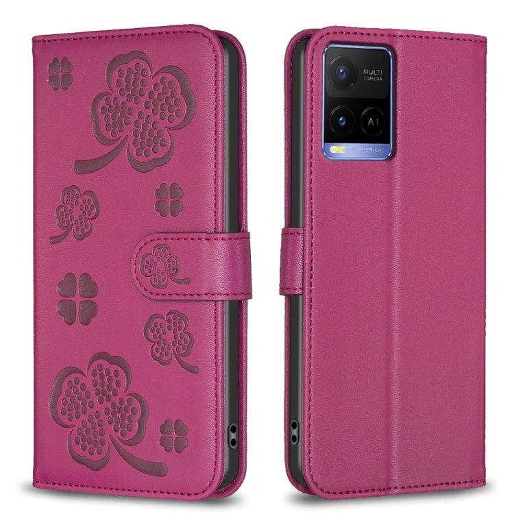 Funda de Cuero para Motorola Moto G14 4G con Relieve de Cuatro Hojas (Rojo Rosa)