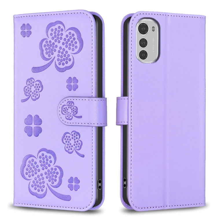Funda para Motorola Moto E40 / E30 de Cuero con Relieve de Cuatro Hojas (PĂșrpura)