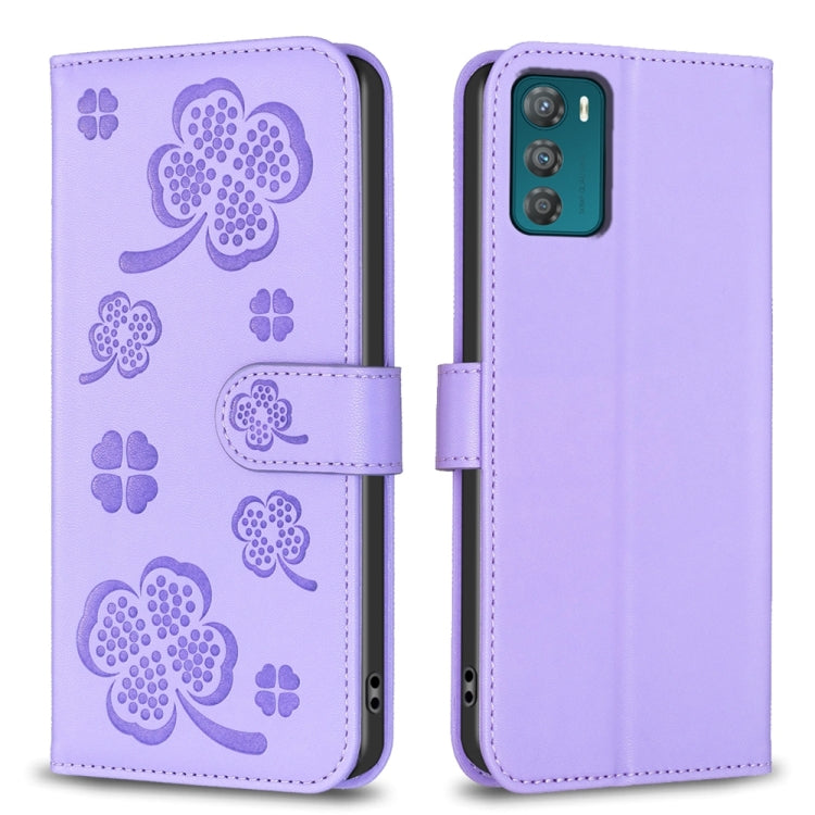 Funda de Cuero para Motorola Moto E32 4G con Relieve de Cuatro Hojas (PĂșrpura)
