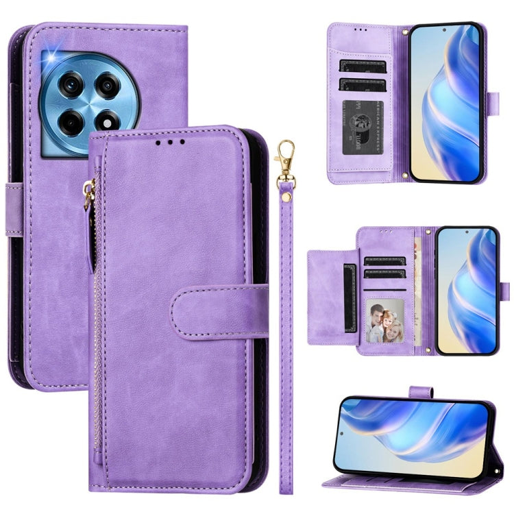 Funda de Cuero con Cremallera y Ranuras para Tarjetas para OnePlus 12 Global (Morado)