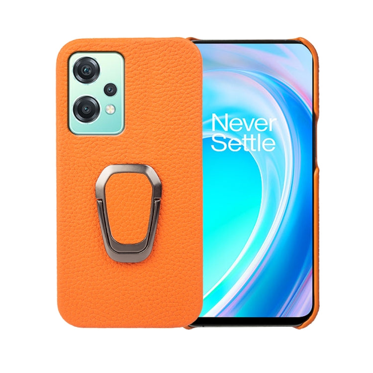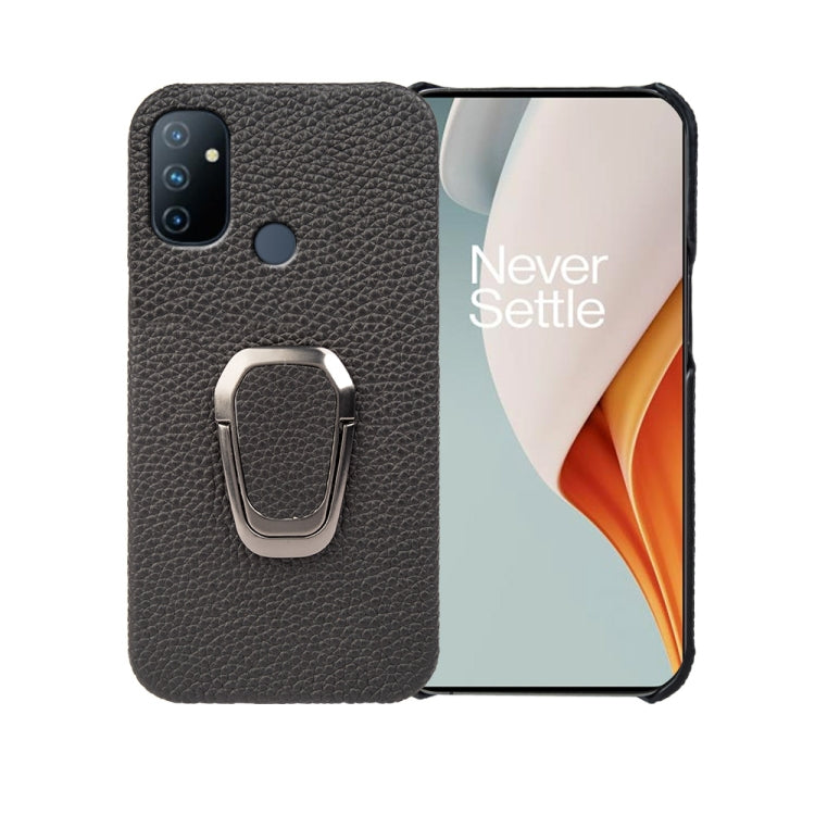 Funda para OnePlus Nord N100 con Ring Holder y Textura Litchi de Cuero Genuino (Negro)