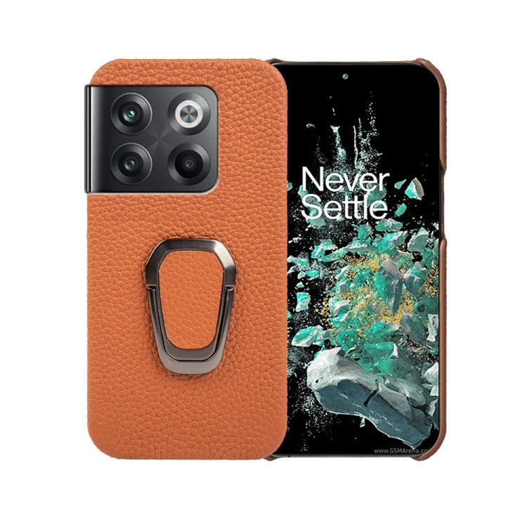 Funda para OnePlus Ace Pro con Ring Holder y Textura Litchi de Cuero Genuino (MarrĂłn)