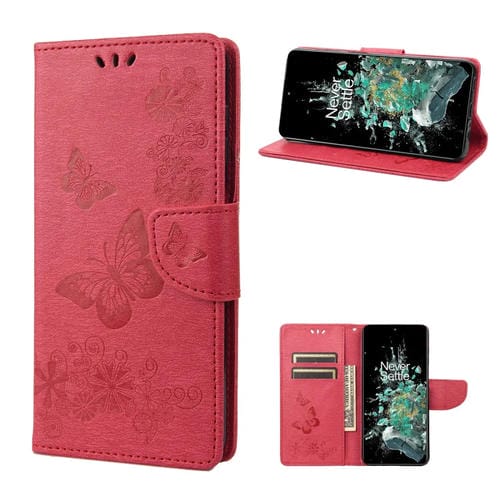 Estuche para OnePlus 10T de Cuero con Tapa Horizontal y Relieve de Mariposa (Rojo)