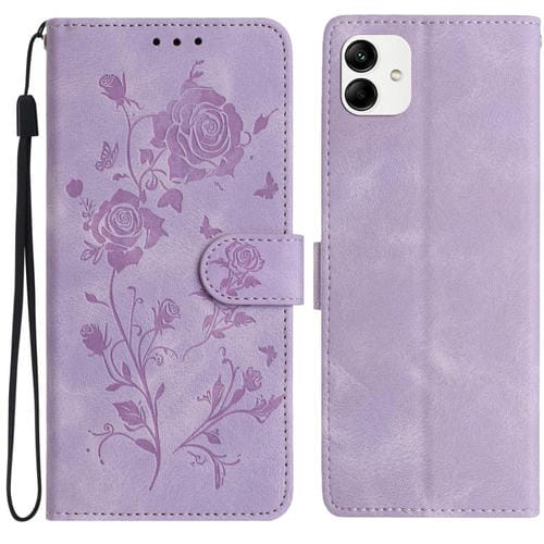 Funda de cuero con estampado de rosas en relieve para Samsung Galaxy A04 (morado claro)
