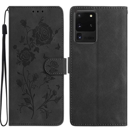 Funda de cuero con estampado de rosas en relieve para Samsung Galaxy S20 Ultra 5G (negra)