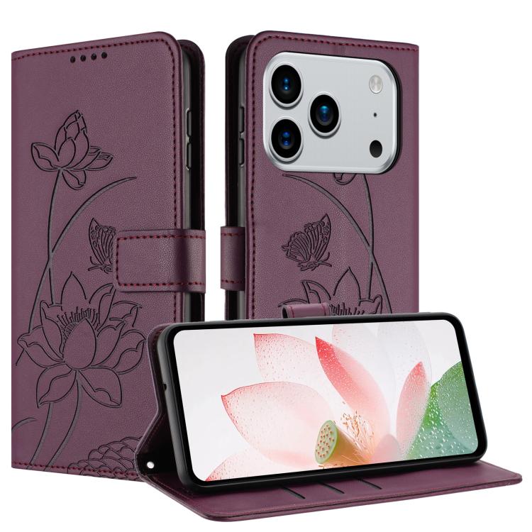 Funda de piel con relieve de loto para iPhone 17 Pro con cordón (morado)