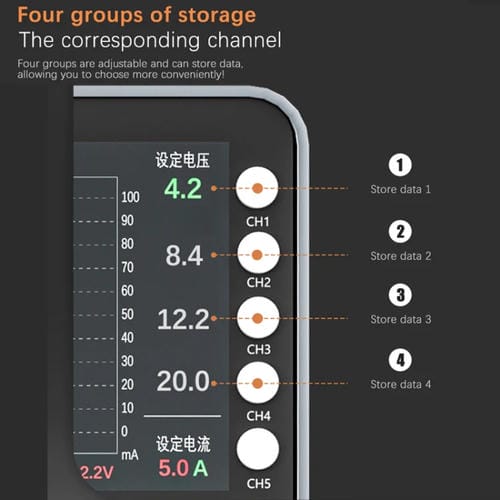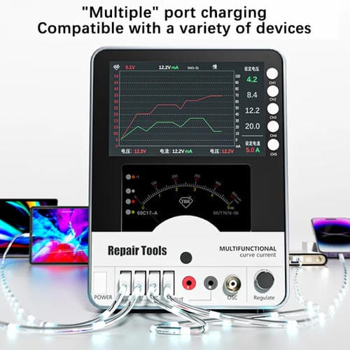 - Potencia de 150 W, voltaje ajustable hasta 30 V, Corriente ajustable hasta 5 A, salida de alta frecuencia, visualización hiperbólica de Corriente y voltaje, incluye funciones de Carga rápida y Carga normal, memoria para almacenar hasta cuatro grupos de configuraciones