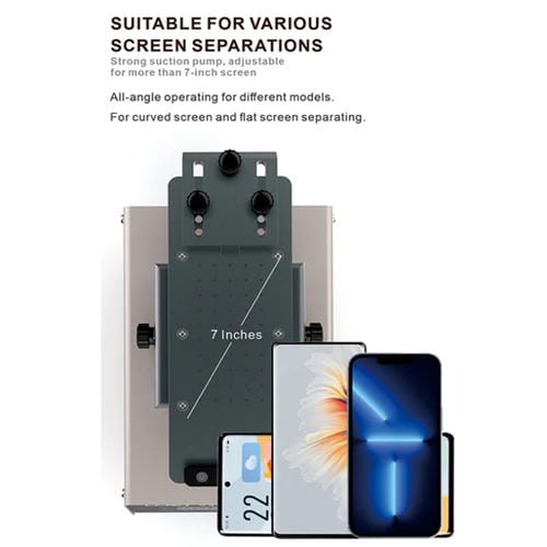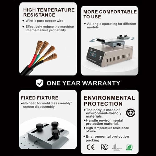 El Baku BA949C Calentador de Pantalla LCD (2021) es un equipo profesional diseñado para la separación y reparación de Pantallas LCD en dispositivos Móviles. Compatible con una amplia variedad de Teléfonos, este calentador utiliza una bomba de aire integrada que genera una presión de 45KPA para sostener firmemente la Pantalla durante el proceso de despegue. Su diseño incluye rotación de 360 grados y un Soporte ajustable que facilita el manejo y la adaptación a diferentes tamaños de Pantalla. Funciona con voltajes de 110V y 220V, garantizando versatilidad en su uso. Fabricado con materiales metálicos, ABS y componentes electrónicos, ofrece estabilidad y seguridad durante las reparaciones Técnicas.