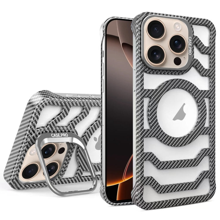 Estuche para Teléfono Magsafe con Soporte y Protección de Lente Fibra de Carbono para iPhone 16 Pro Max (Gris)