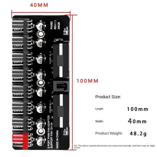 • Expansión a 8 Puertos para Ventiladores, Alimentación directa desde fuente de poder, Soporte para Ventiladores de alta potencia (12V 2A), dimensiones aproximadas 10 x 4 cm, peso 48,2 g, incluye Adhesivo EVA y 10 ataduras de Cable de nailon