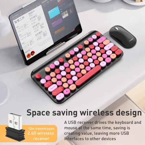 El Conjunto Inalámbrico Portátil Forev FFVWI9 (Rojo) incluye un Teclado y un Mouse diseñados para ofrecer una experiencia de uso cómoda y eficiente en entornos de trabajo o estudio. Compatible con dispositivos que soportan Conexión Inalámbrica 2.4G, este Conjunto destaca por su diseño ergonómico y funcionalidad optimizada. El Teclado cuenta con 75 teclas de estilo retro que simulan la sensación mecánica mediante una capa inferior de película delgada que asegura un sonido ligero y silencioso, ideal para usuarios que reparan por cuenta propia o profesionales que requieren precisión y confort. El Mouse ofrece una resolución de 1000 DPI, proporcionando un control preciso del cursor. Ambos dispositivos funcionan con Baterías estándar (Teclado con dos Baterías AAA y Mouse con una Batería AA), y su voltaje operativo es de 3V, garantizando un rendimiento estable y duradero.