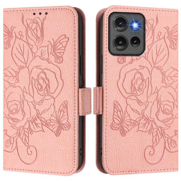 Funda de Cuero Antirrobo con RFID y Relieve para Motorola Edge 50 5G (Rosa)