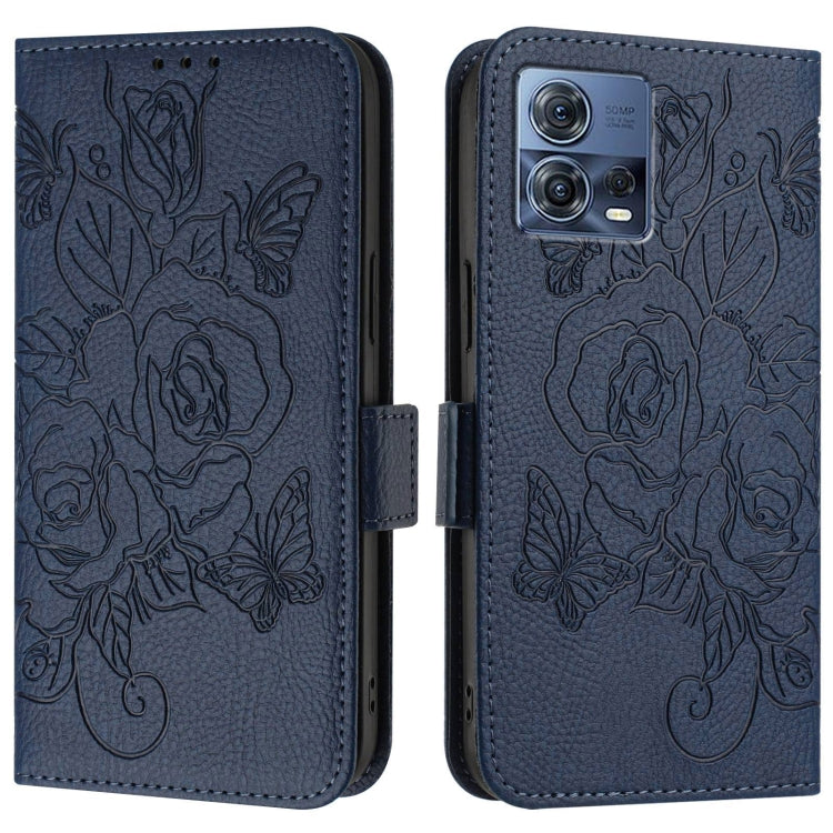 Funda de Cuero Antirrobo RFID con Relieve para Motorola Moto G72 (Azul Oscuro)