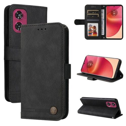 Funda de Cuero con Botones de Metal y Diseño Árbol de la Vida para Motorola Edge 50 Fusion (Negro)