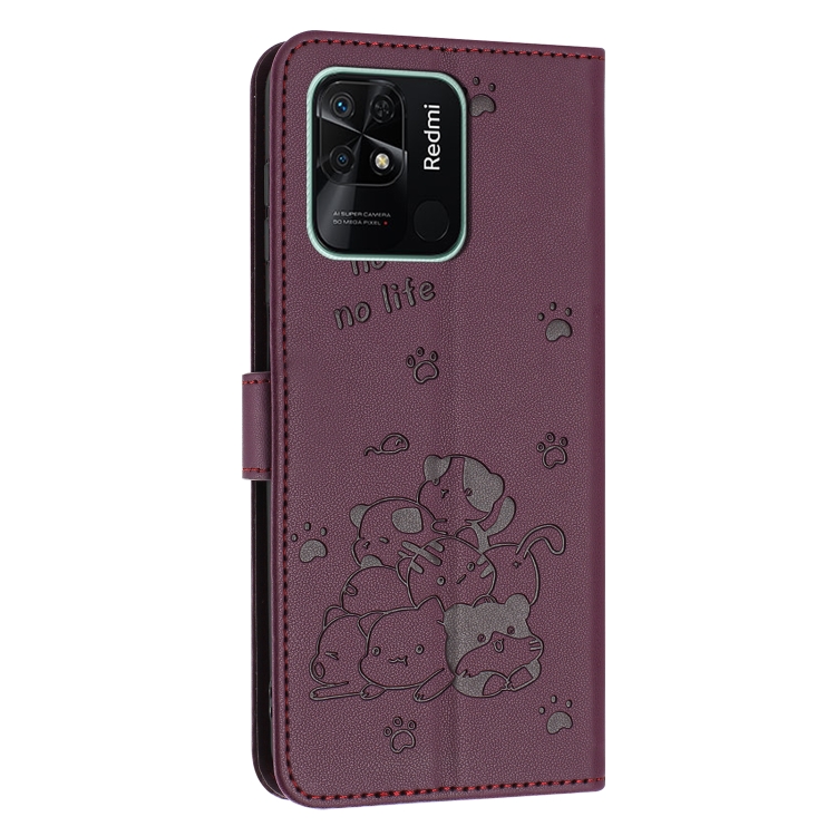 Funda de Piel con Diseño de Gatito En Relieve para Redmi 10C 4G Global con Cordón (Rojo Vino)