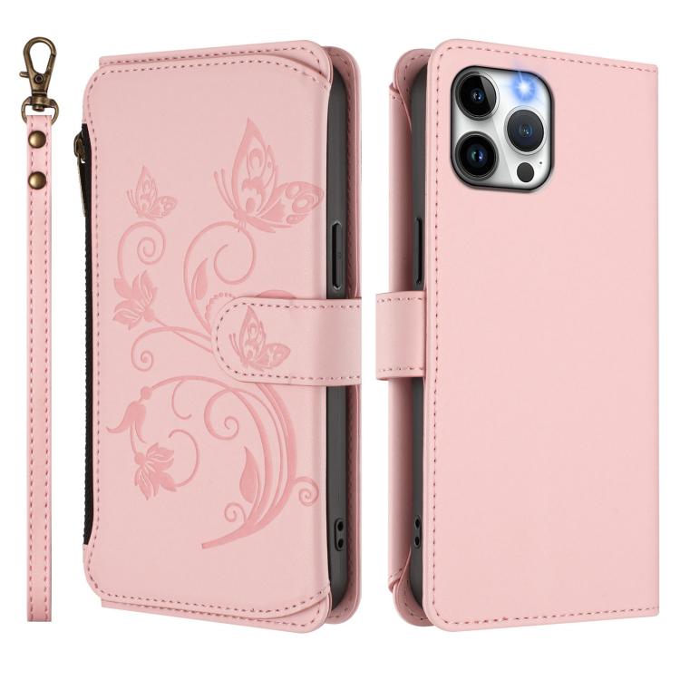 Funda de cuero con cremallera para iPhone 12 Pro Max, diseño de mariposas, flores y amor (rosa)