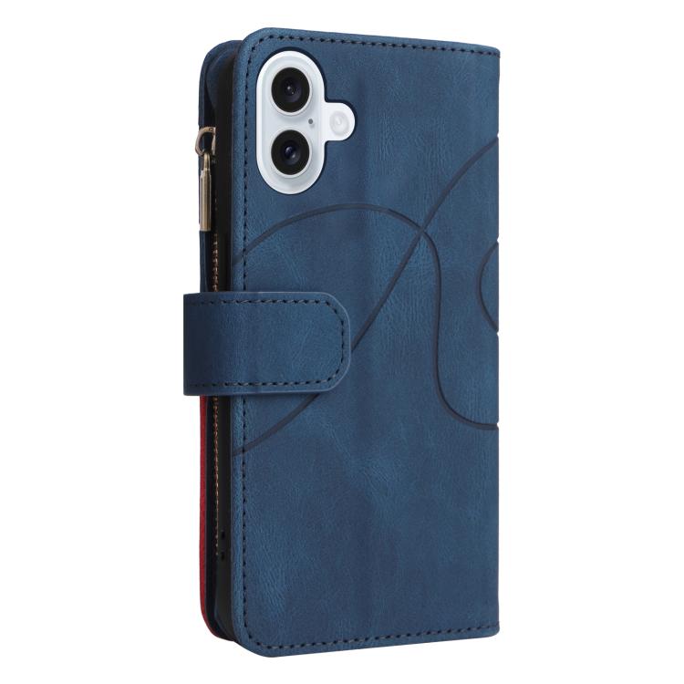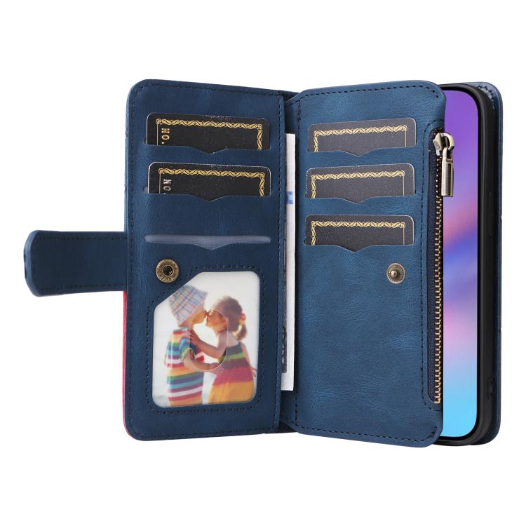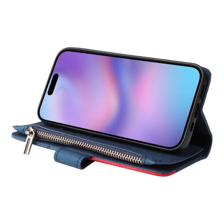 Funda de cuero con cremallera para iPhone 17, bicolor, con 9 ranuras para tarjetas (azul)