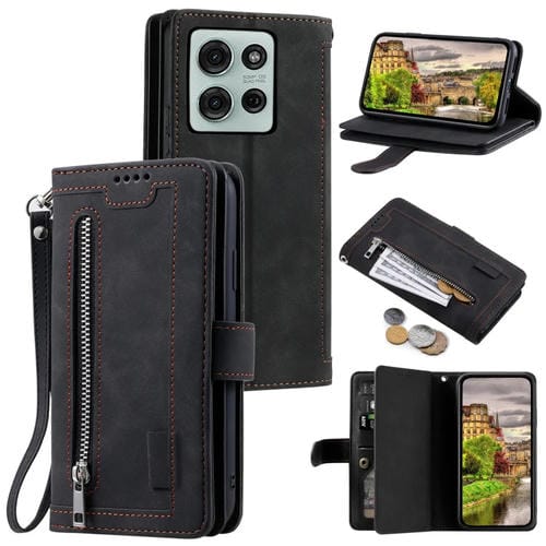 Funda de Cuero con Cremallera y Cordón para Motorola Moto G75 5G (Negro)