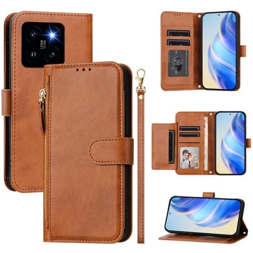 Funda de Cuero con Cremallera y Ranuras para Múltiples Tarjetas para Xiaomi 14 Pro Global (Marrón)