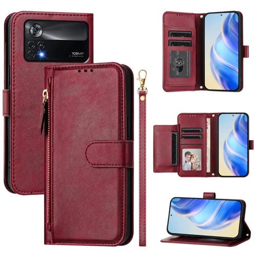 Funda de Cuero con Cremallera y Ranuras para Múltiples Tarjetas para Xiaomi Poco X4 Pro 5G (Rojo Oscuro)