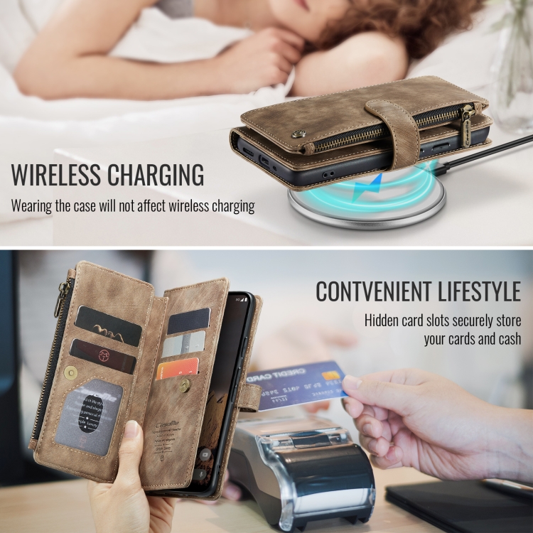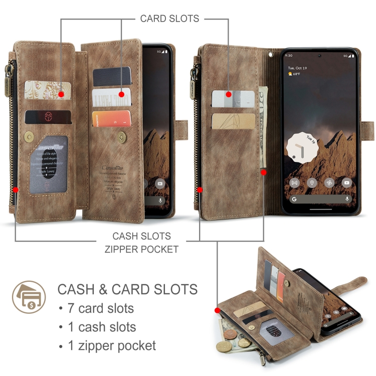 Funda de Cuero Caseme C30 para Google Pixel 9 y 9 Pro con Cremallera y Ranuras para Tarjetas (Marrón)