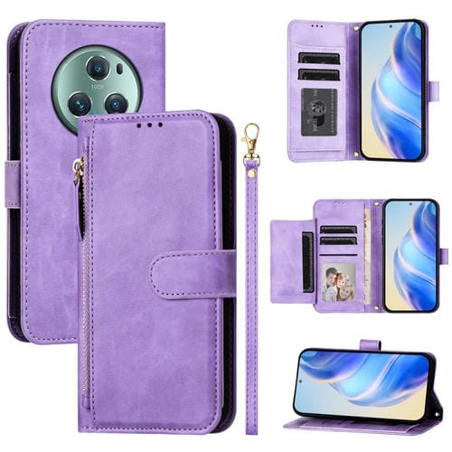 Funda de Cuero Tipo Billetera para Honor Magic5 Pro con Cremallera y Ranuras (Morado)