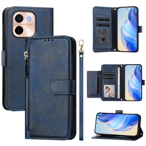 Funda de Cuero con Cremallera y Ranuras para Varias Tarjetas para Vivo Y28 4G (Azul)