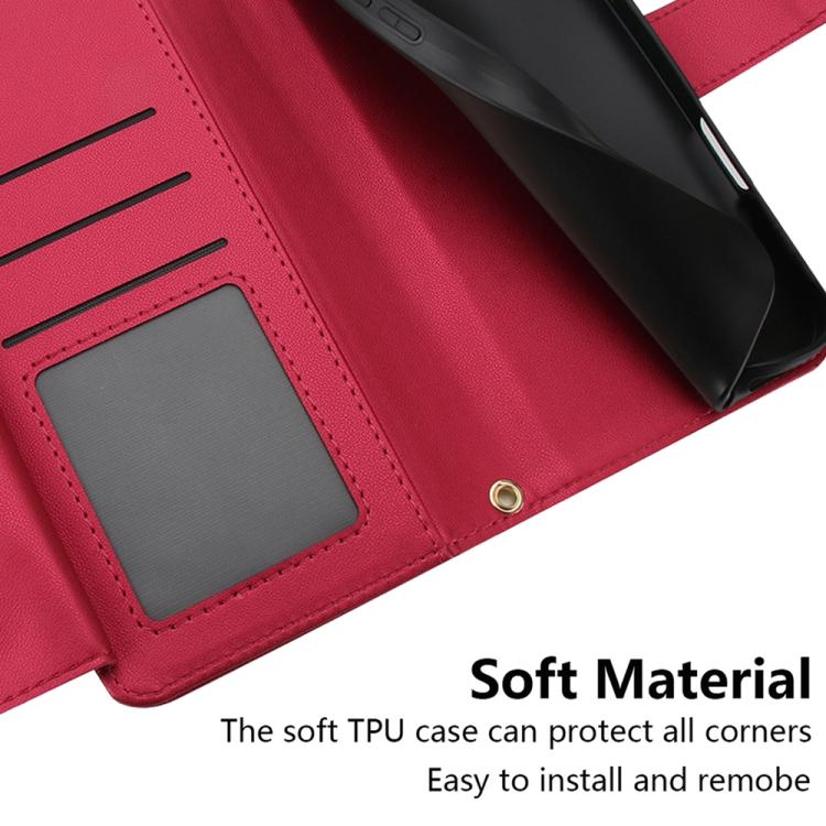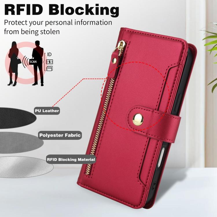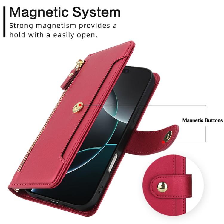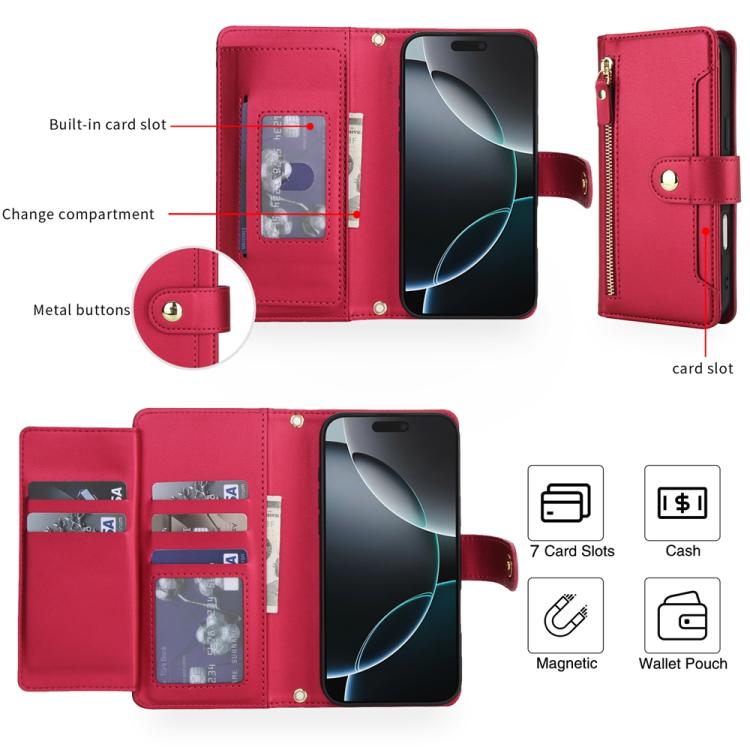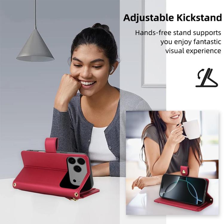 Funda de cuero con cremallera y siete ranuras para tarjetas para iPhone 17 Pro Max con cordón (roja)