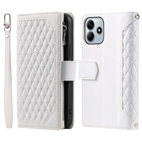Funda de Cuero con Cremallera y Textura de Cuadrícula para Xiaomi Redmi Note 14 5G con Cordón (Blanco)
