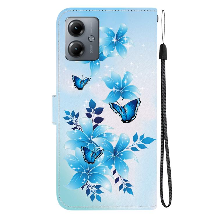 Funda de Cuero para Motorola Moto G14 con Dibujo de Colores y Textura de Cristal (Mariposas Azules)