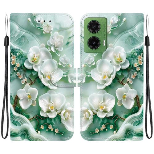 Funda de Cuero Motorola Moto G35 con Dibujo de Colores y Textura de Cristal (Flores de Jade)