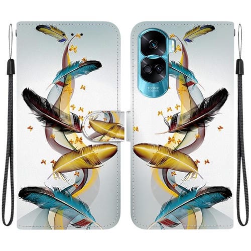 Funda de Cuero Honor 90 Lite con Dibujo de Colores y Textura de Cristal (Plumas de Mariposa Doradas)