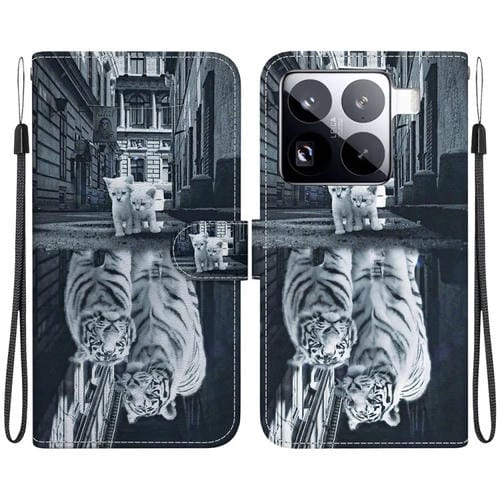 Funda De Cuero Con Dibujo De Colores Y Textura De Cristal Para Xiaomi 15 Pro (Reflejo De Tigre Y Gato)