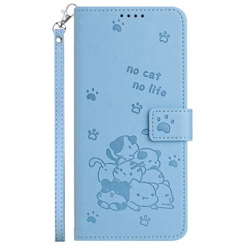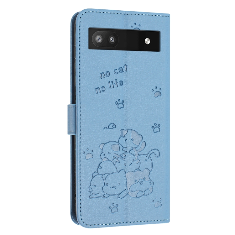 Funda de Cuero para Google Pixel 6A con Diseño de Gatito en Relieve y Cordón (Azul)
